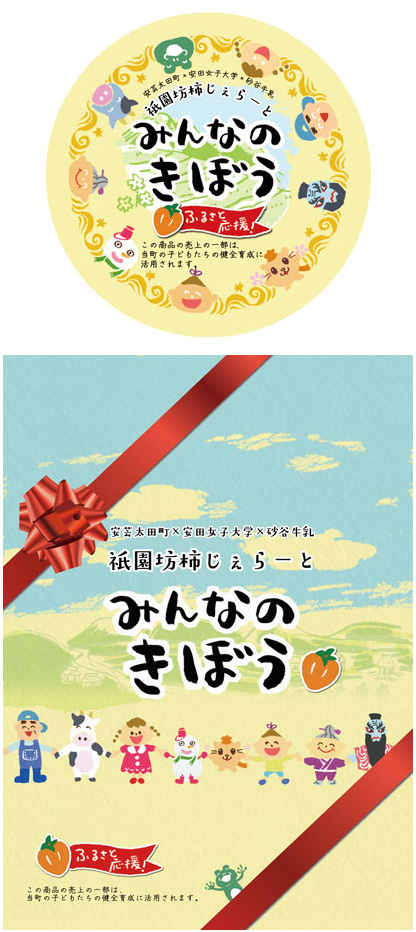 安芸太田町と、安田女子大学、砂谷牛乳が共同開発された、特産品祇園坊柿を使ったジェラートのためのラベルと、ギフト箱用のラベルです。 2015年夏に公募で優秀賞に選ばれた3人の方の案をMIXして出来上がりました。 みんなで手を取り助け合って行く。繋って、輪になる。 古くから大切に守り抜かれた柿の王様「祇園坊柿」を通じて、町や村全体がもっとイキイキと活性化するようにという思いが込められています。