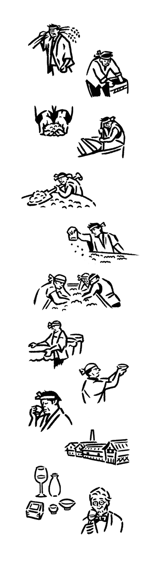 楯の川酒造様とフランスの人気バンドPHOENIXのコラボ日本酒で、ボトルを包む手ぬぐい用のイラストを描かせていただきました。 若い世代や海外の方など、より幅広い方々へ日本の文化をわかりやすくお伝えしたいというコンセプトで、日本酒の製造工程と蔵人さん達の姿を描いています。