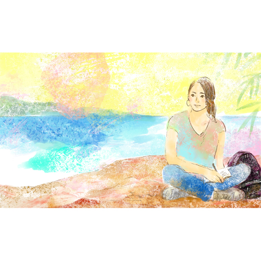 小説家の詢川華子さまのwebサイトにイラストを描かせていただきました。 旅を愛する彼女が、旅先で物語を紡いでいるシーンです。 詢川さんの好きなオーストラリアの土の色、オパール石の洞窟で見た淡く色が重なるキラキラ感をイメージしました。 詢川華子さんHP https://junkawa-hanako.com 詢川さんのnoteはこちら https://note.com/feelingoodever/